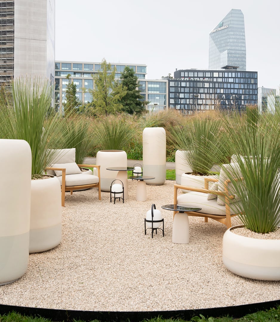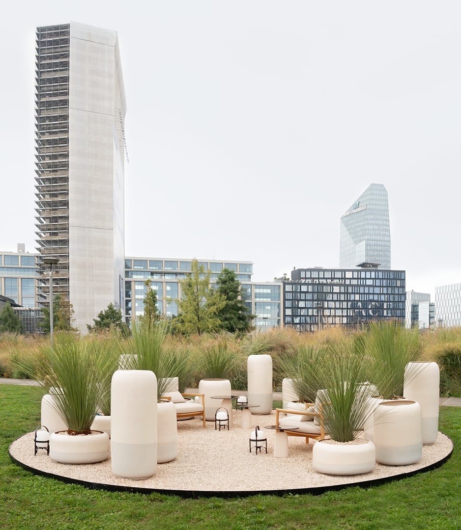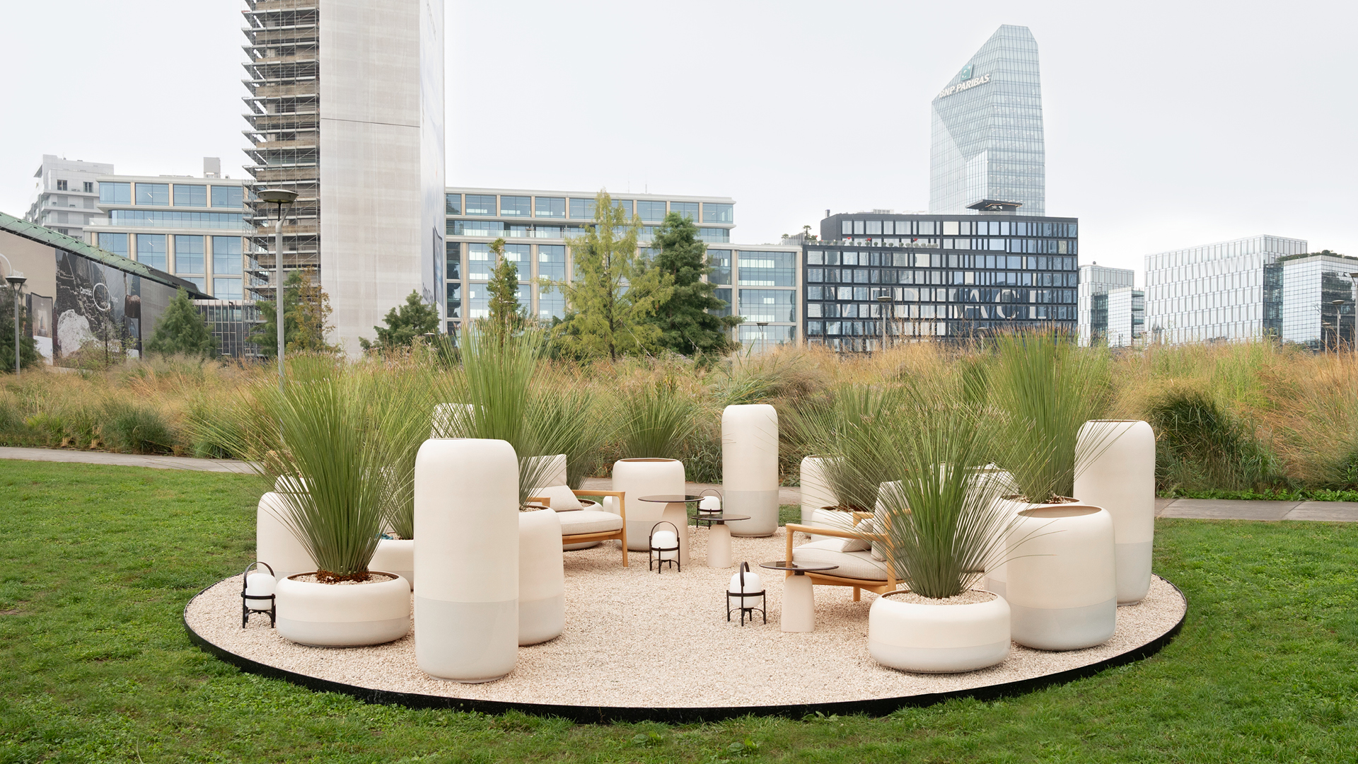 Nach dem Leitthema „Natural Theatre“ schafft das Unternehmen die Installation „Poliform Circle“, einen exklusiven, gemütlich anmutenden und belebenden Raum. Er stellt gleichzeitig eine zeitgenössische Interpretation der italienischen Gärten dar, aus der sich eine geometrische und geordnete Komposition des Raums ergibt. Protagonisten dieser grünen Bühne in der Stadt sind die kleinen Sessel für den Außenbereich Magnolia von Emmanuel Gallina und die Vasen Crew von Jean-Marie Massaud, die beide Teil der neuen Outdoor-Kollektion von Poliform sind. Die Kombination von Sitzgelegenheiten, die von den organischen Linien der Äste inspiriert sind, und den Vasen, die die Reinheit der Keramik durch perfekt kreisförmige Formen hervorheben, schafft eine Harmonie, die die Schönheit der Natur würdigt.