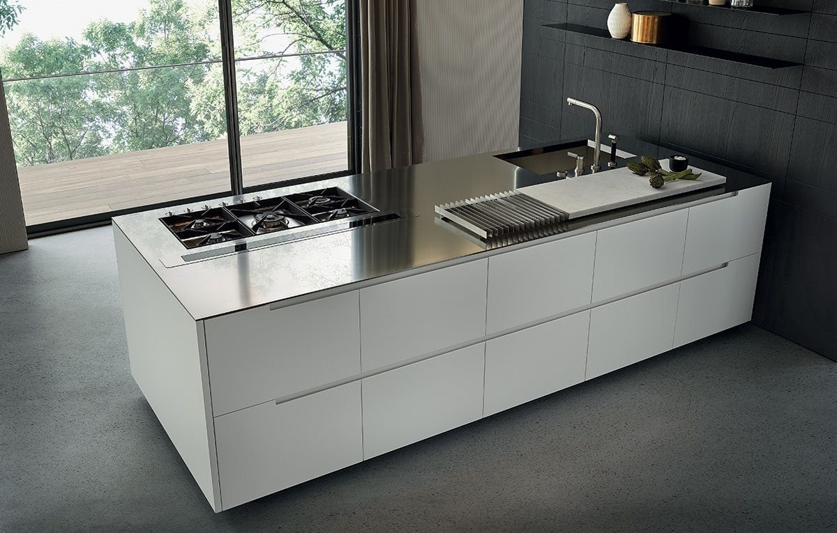 Sharp, design by Daniel Libeskind, made entirely in Dupont Corian, is a generously proportioned kitchen devised to convey a timeless convivial spirit while enhancing a bold relationship between the functional areas and the dining area. Conceived as an architectural feature, it emphasises the designer’s flair in its sharp silhouette.