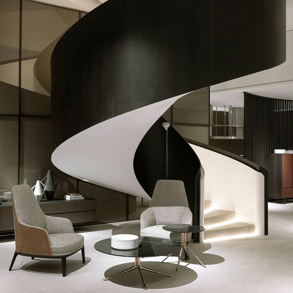 On entering the store which overlooks a busy shopping street, the visitor is struck most of all by the vast wooden spiral staircase with stone steps located in the living area on the ground floor. Behind the staircase, bronzed mirrors with metal frames contribute to making the space even more elegant.