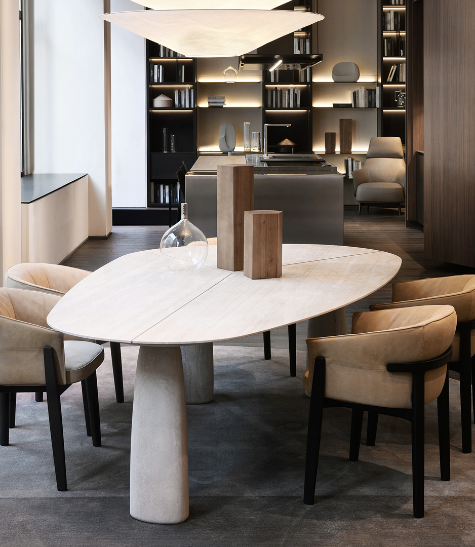 A strongly poetic imprint is the common thread running through the furniture, upholstery and accessories in the new collection. Like the Ernest sofa, which with its compositional freedom and distinctive unstructured design leaves plenty of room for the imagination. The designer Jean-Marie Massaud complements it with the line of coffee tables of the same name, versatile, dynamic, modular just like elements of a jigsaw puzzle. Equally striking is the Adrien table with its sculptural, asymmetrical legs that reinterpret a domestic archetype. The same vocation for Emmanuel Gallina in the Monolith Indoor table, which translates the archaic and monumental lines of dolmens into a product for the home.
