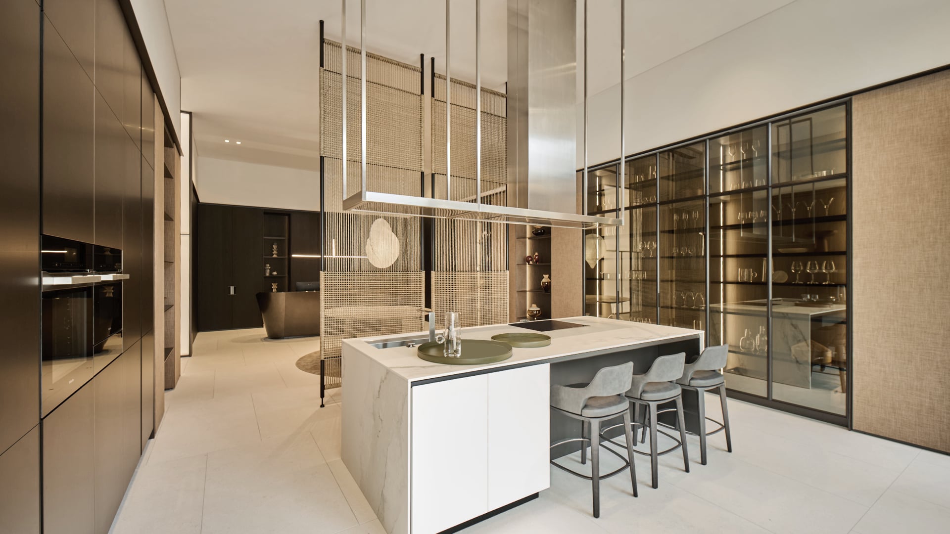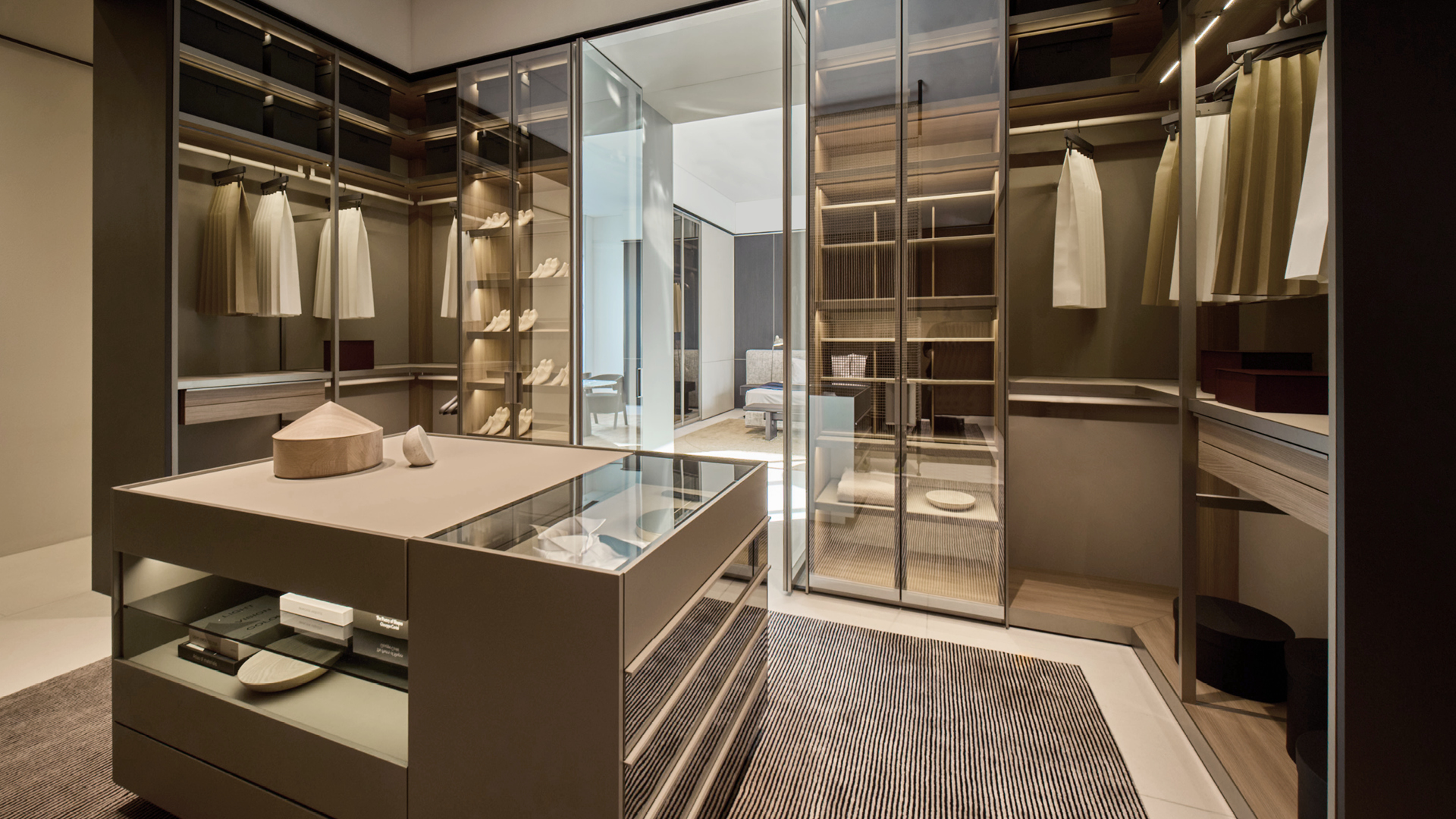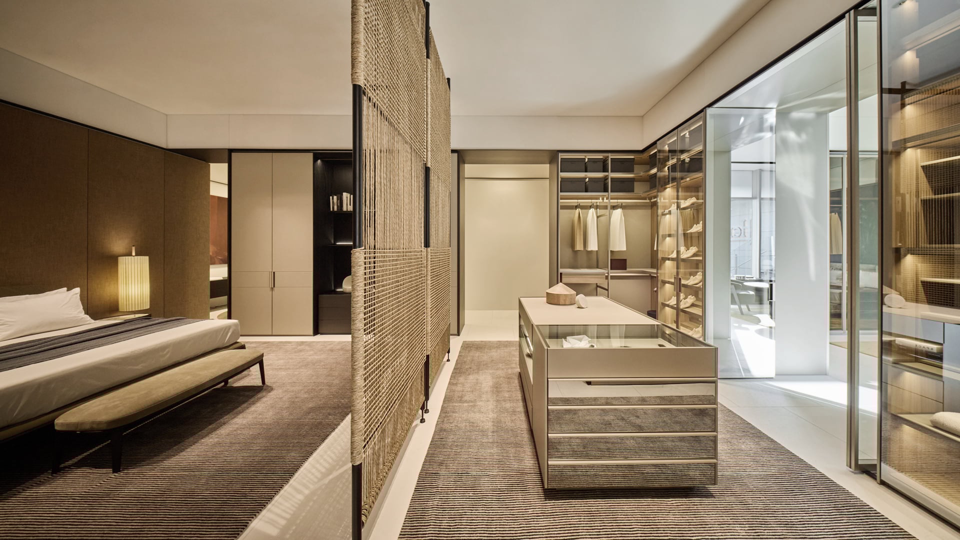 The ground floor is dedicated to the living environment and features some of the brand’s most iconic kitchens, accompanied by a wide selection of upholstered furniture inspired by the theme of relaxation, alongside a range of accessories that enhance the setting with refined functionality — all in perfect stylistic coherence. On the upper floor, the focus shifts to the night area, where Poliform’s systems create enveloping and intimate architectural solutions.