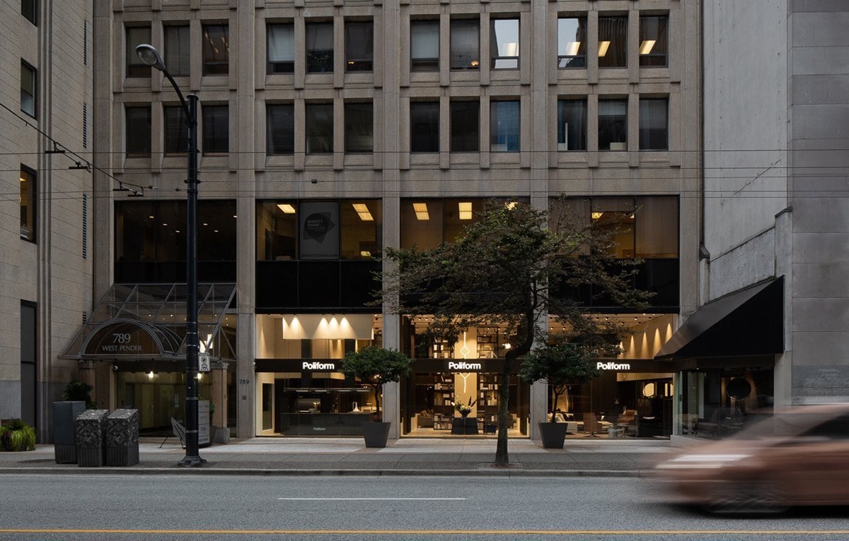 An elegant and exclusive exhibition space characterised by its bold architectural identity and large windows that extend the space outwards.Adopting the “Poliform house” design concept—with all features stylistically consistent—Poliform Vancouver was built to inspire. Visitors exploring the site, which is over 500 square metres in size, will experience a stylish showcase of domestic living in which Poliform’s refined interior-design solutions directly evoke the perfect family home.