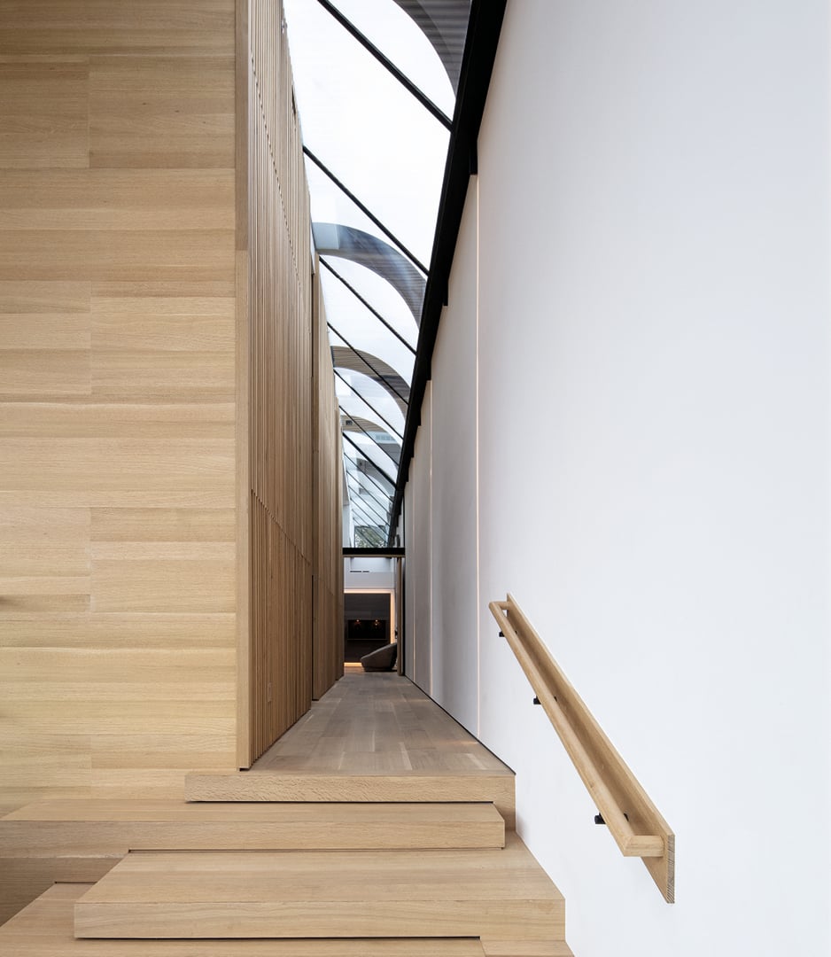 The linear rain-screen facade creates a sculptural and visually compelling pattern along the street. This was achieved by a series of flat and folded metal panels that clad the street-facing concrete wall. The folded panels creates a random sculptural pattern that becomes denser closer to the main entrance, which passively guides guests towards the front door. Above the facade, an array of curved steel beams support a continuous skylight, providing ample natural light to the upper level of the house.
