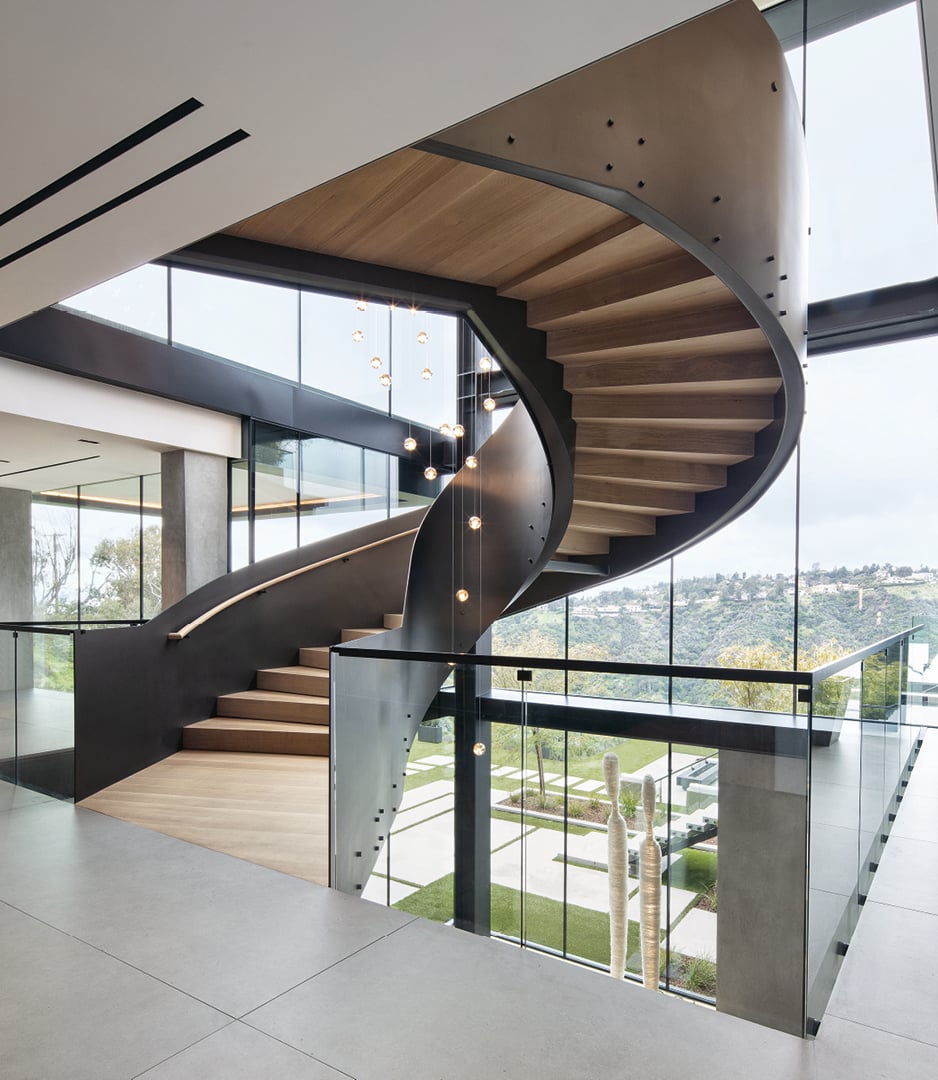 The entry gate features a water element that leads to a large pivoting steel and wood front door. Upon entering the house, visitors are greeted by an open floor plan that connects all levels of the home. A curving suspended grand entry stair descends to the main, more public level, which includes the living, dining, family, Poliform kitchen/scullery featuring the Phoenix system with elm wood veneer, shaker modular backs, a bronze metallic lacquer island, and gallery spaces. The indoor-outdoor dynamic is fully expressed in all the rooms on the main level, where massive sliding glass pocket doors connect the kitchen, dining, and living areas to a floating pool and expansive outdoor deck areas with stunning views of the canyon and the ocean. On the upper level, past the curving steel staircase are the bedroom suites and the more private master suite at the far end of the house. The lower level of the house features the theater, extensive wellness spa area, gym, gallery space, and additional bedroom suites. This level opens to the large backyard, bar, entertainment area, and direct access to the pool above.