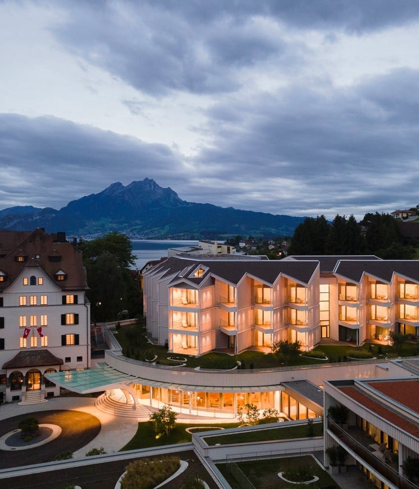 The Chenot Palace in Weggis is a popular hotel overlooking Lake Lucerne, at the foot of the Swiss Alps. It has recently been renovated, adding a modern structure to the existing building, bringing the total number of rooms to ninety-seven.