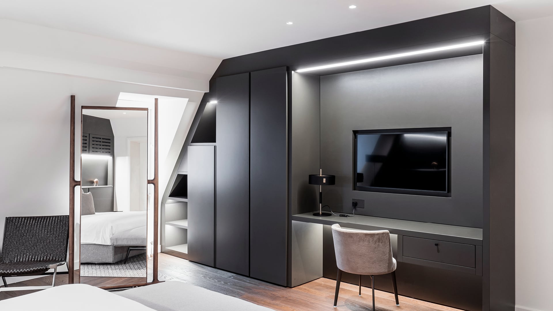 The dressing tables with flush TV units and integrated joinery were also especially produced as was the cladding for the lift areas in leather and vertically textured dark oak veneer to enhance the high ceilings. The final touches were given through the introduction of free-standing furniture from the Poliform collection. Lastly, the specification of sculptural objects and vases by exclusive artist workshops sourced by our team gave a sophisticated touch. Indeed, the project perfectly highlights the added value of our London based bespoke department: the ability to craft completely custom-made designs creating a design narrative. The project, which was completely tailor-made, demonstrates the very best in sartorial finishes, technology, and design.