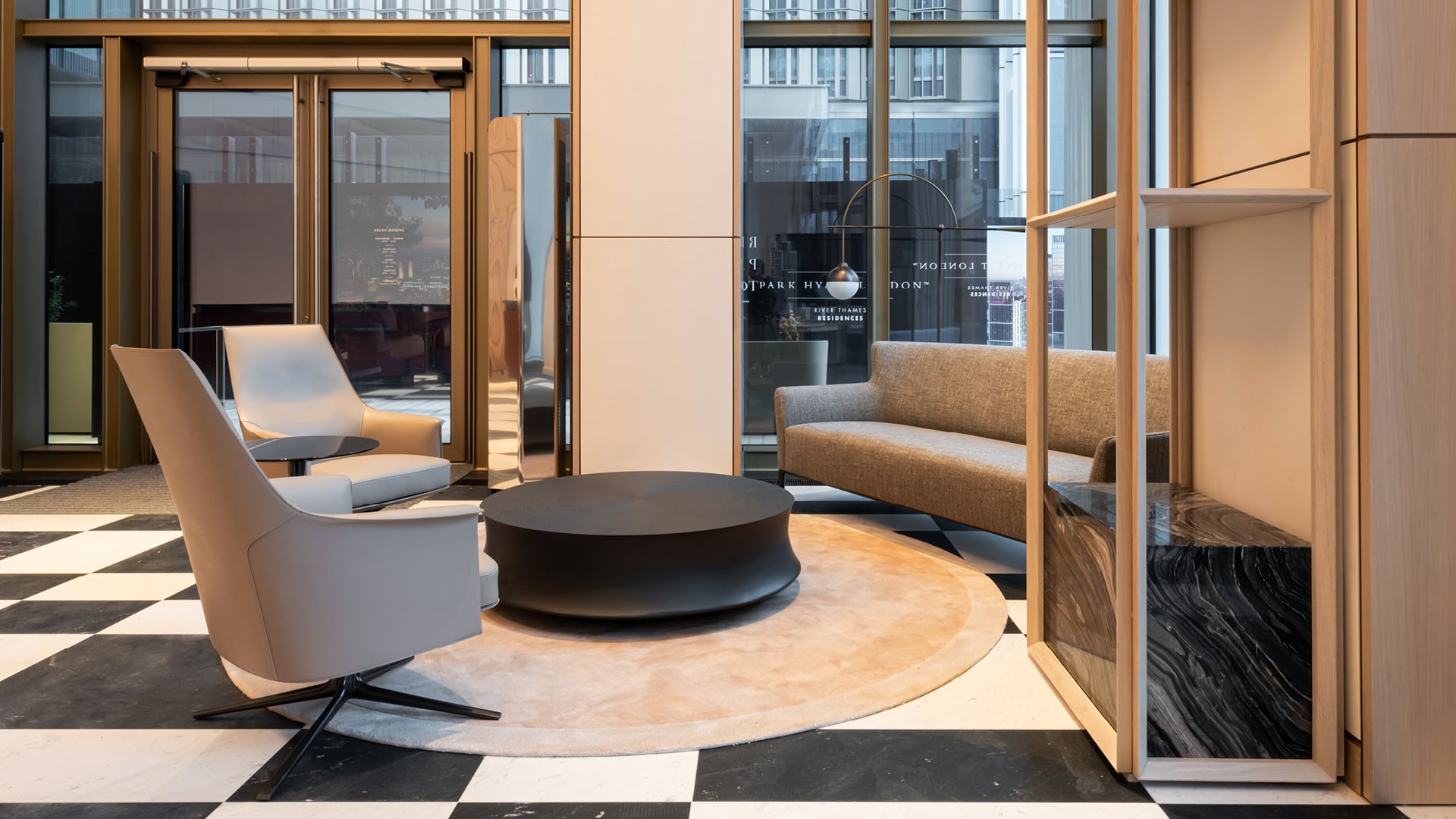 The unique, sculptural contours of the reception desk and bench make them artful creations that are not simply practical furnishings. Lastly, the Bespoke Division crafted a bespoke console in black elm, adorned with intricate detailing and a marble base, adapted to the demands of a bustling entrance lobby, thus completing the ensemble of bespoke creations within the Park Hyatt London River Thames Residences Entrance Lobby.