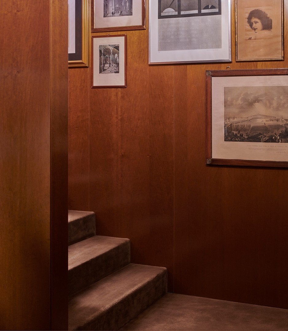 Poliform’s contribution continues in the wardrobes, the bottle racks and the waiter station, in the facings (metals, wood varieties, wallpapers), all the way to the drapes that add a sophisticated, bohemian tone to the private dining room and the privé club lounge in the basement.