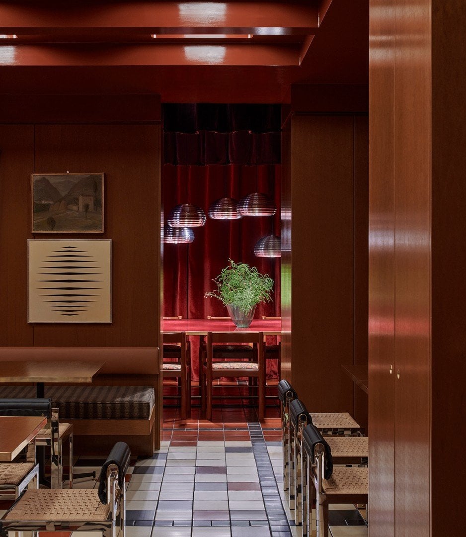 In this context of retro atmospheres inspired by the traditional venues of the Brera district, the Contract Division of Poliform has concentrated on the architectural features, starting with the walnut paneling framing the dining room, and the entrance leading to the counter in the bar, a reminder of the taverns of bygone days.