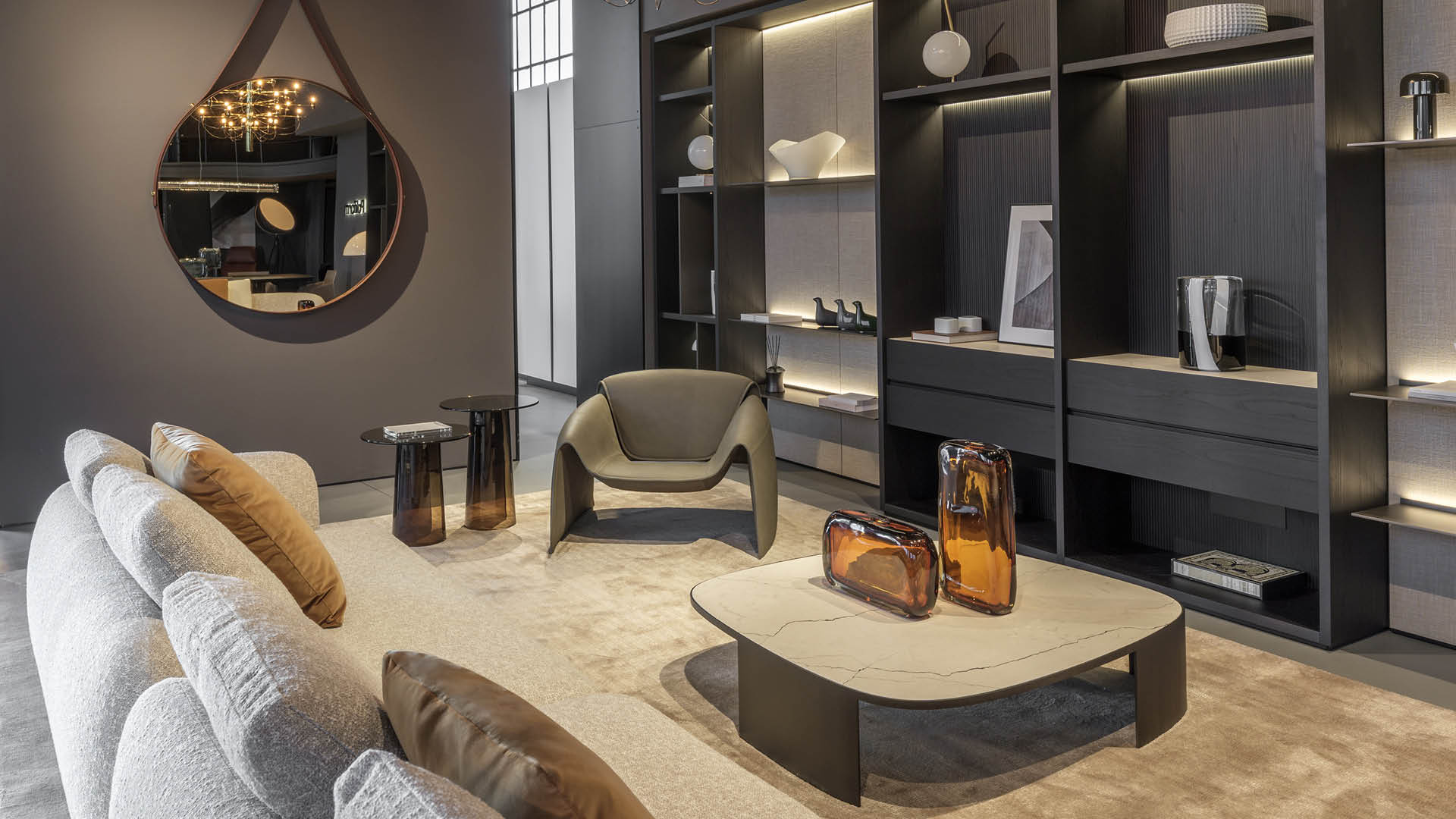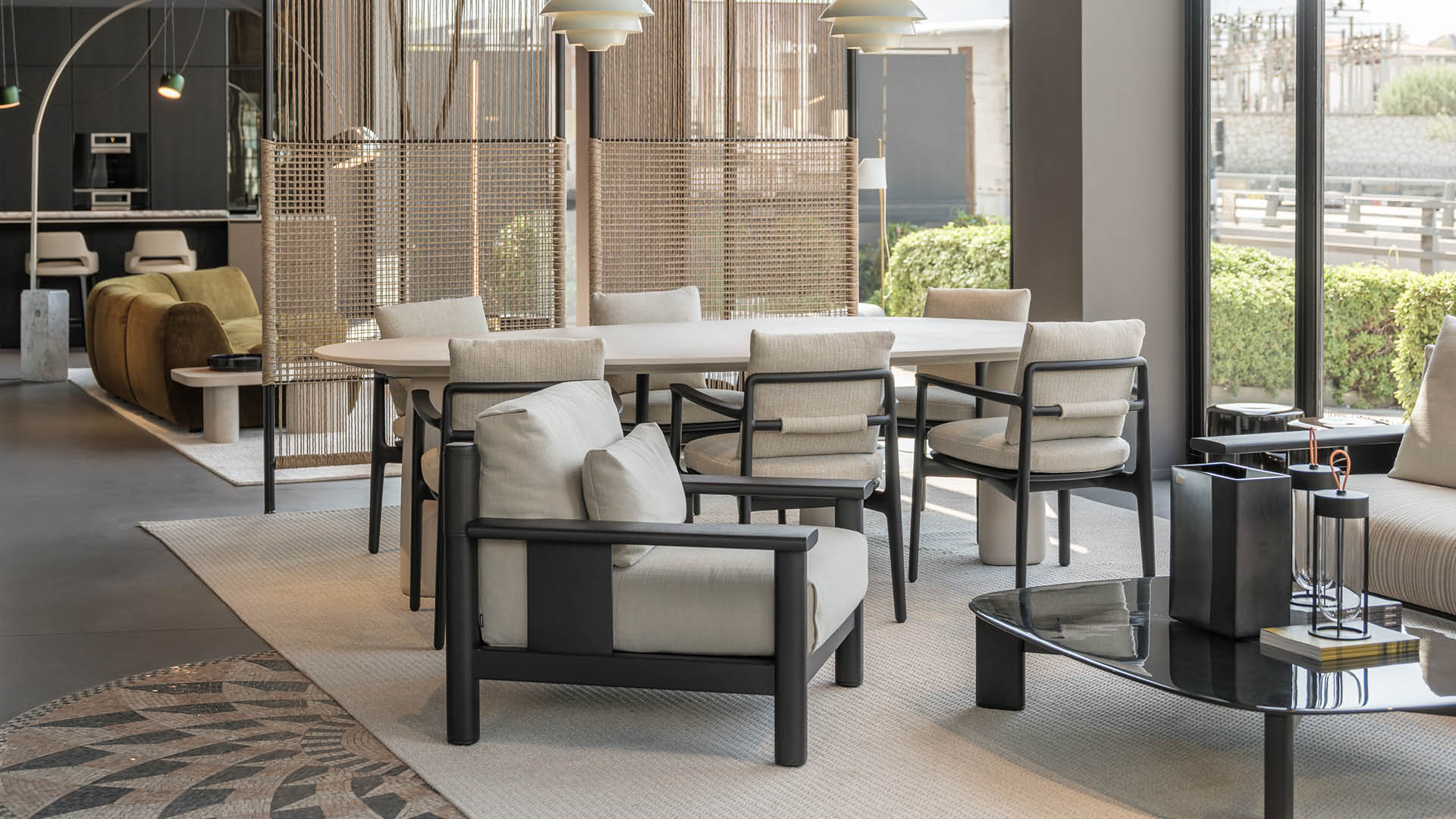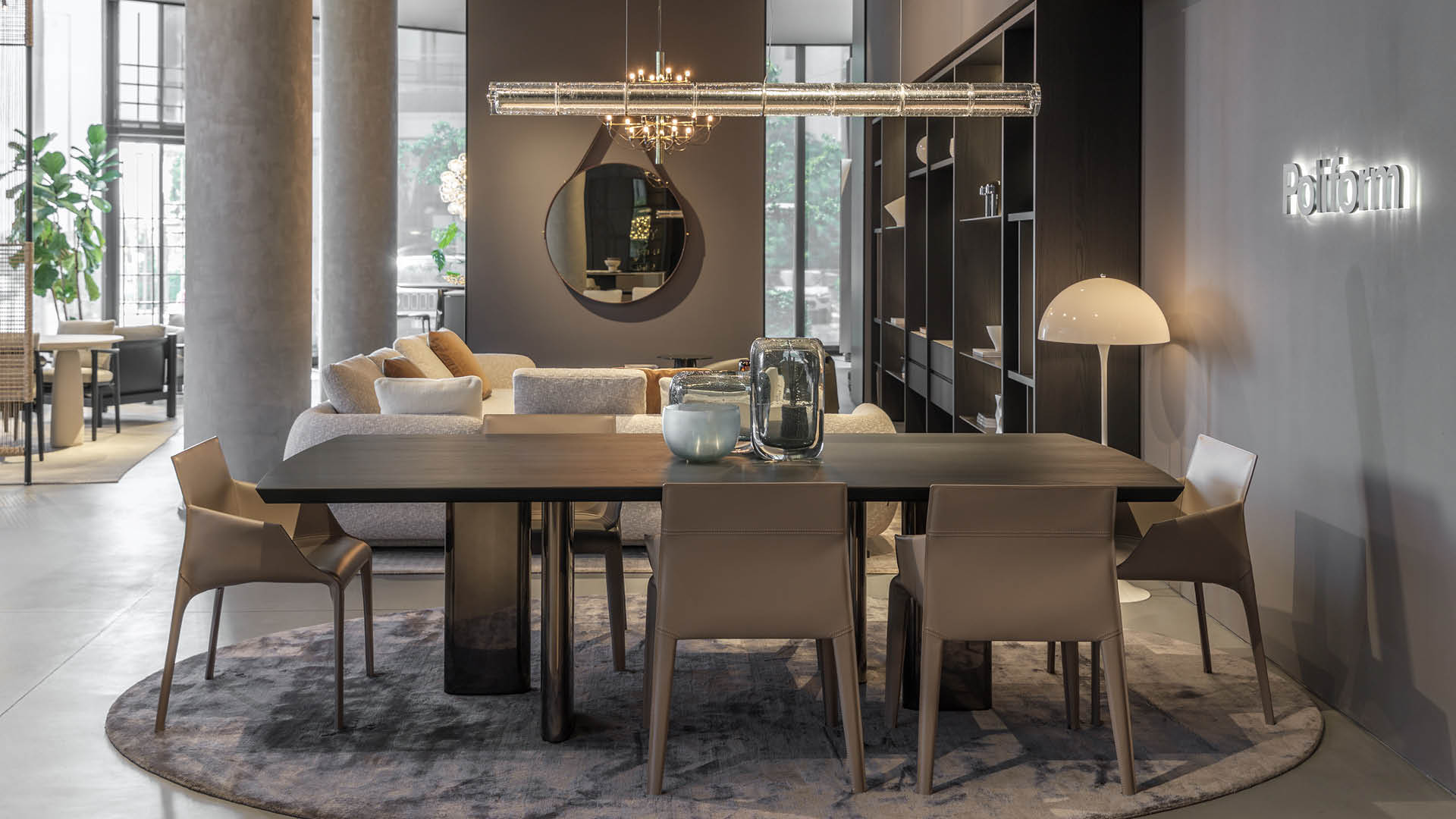 En el área de estar, los sistemas modulares Ernest y Saint Germain destacan junto a los comedores creados con las mesas Monolith y Adrien, acompañados de accesorios funcionales cuidadosamente seleccionados.