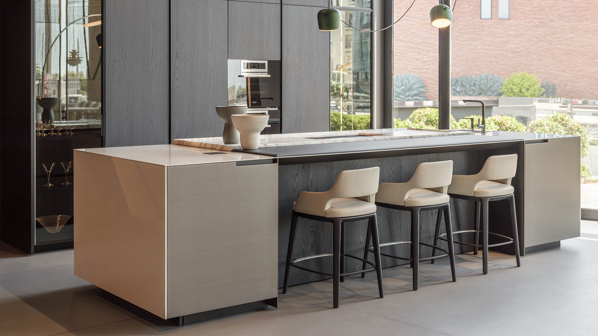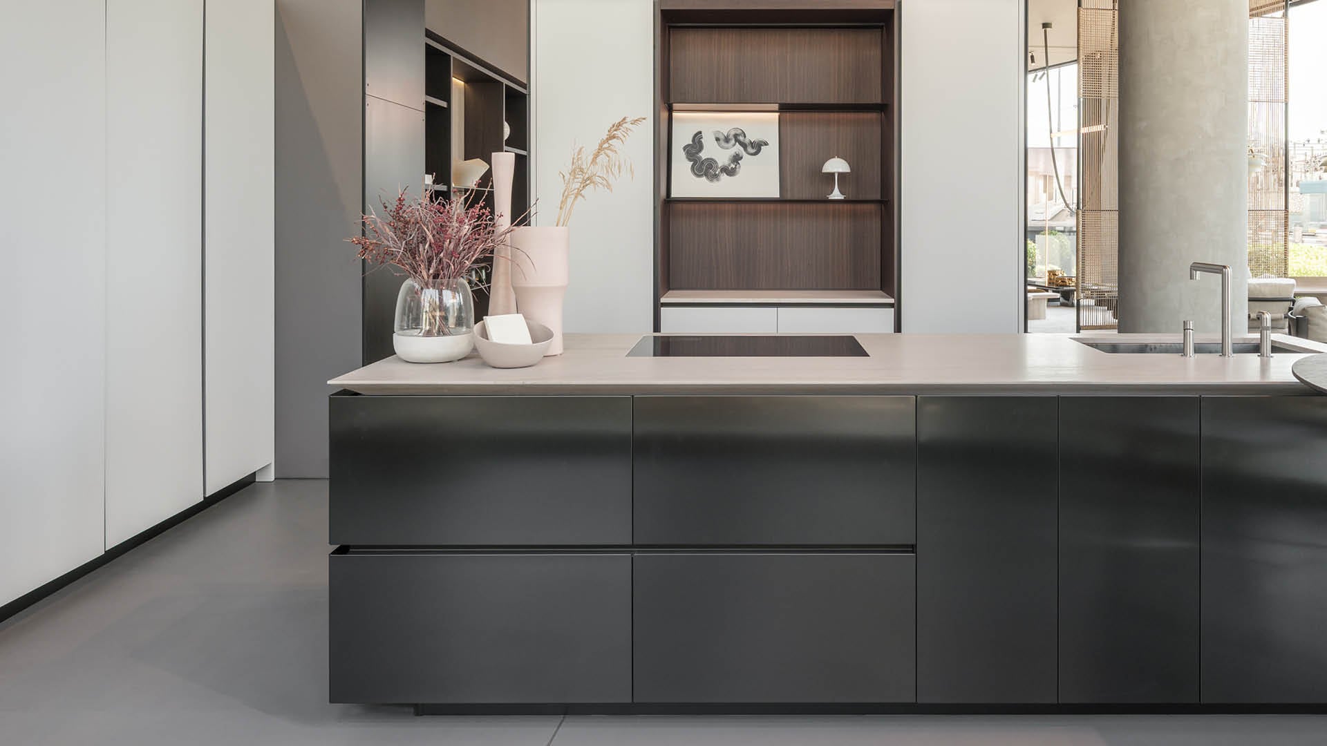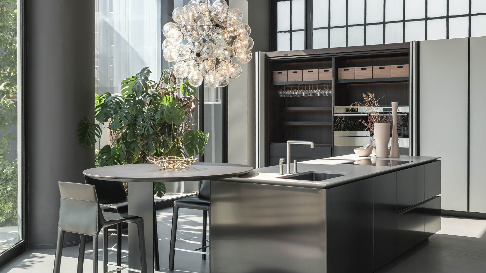 En el área de estar, los sistemas modulares Ernest y Saint Germain destacan junto a los comedores creados con las mesas Monolith y Adrien, acompañados de accesorios funcionales cuidadosamente seleccionados.