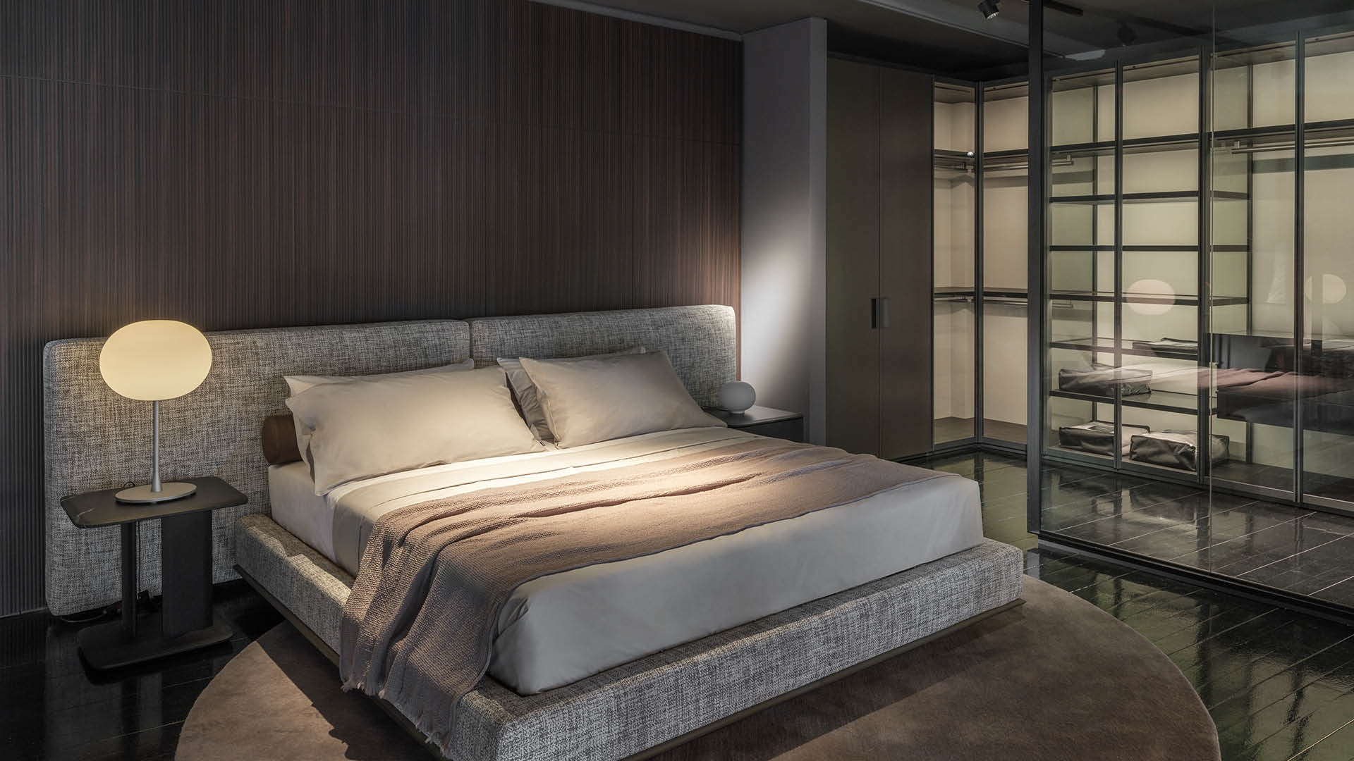 En la entreplanta, la zona de noche recrea la intimidad de un verdadero hogar, con la cama Brera y los sistemas de armarios Ego y Plus, que definen el espacio con elegancia y equilibrio arquitectónico.