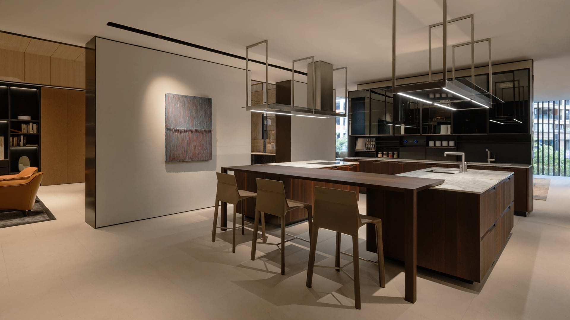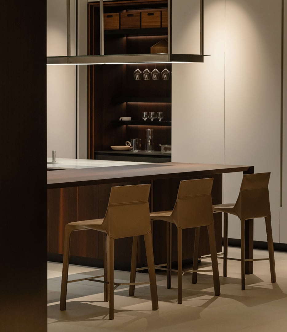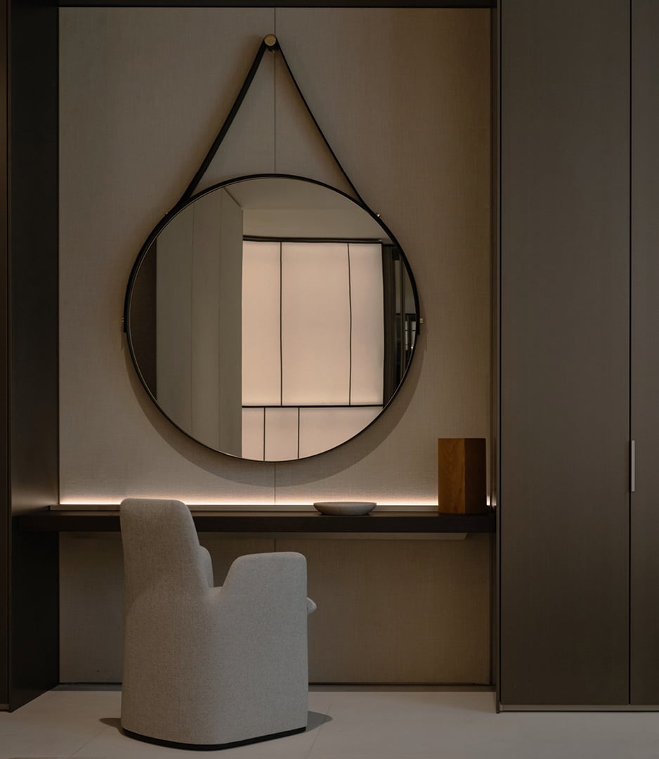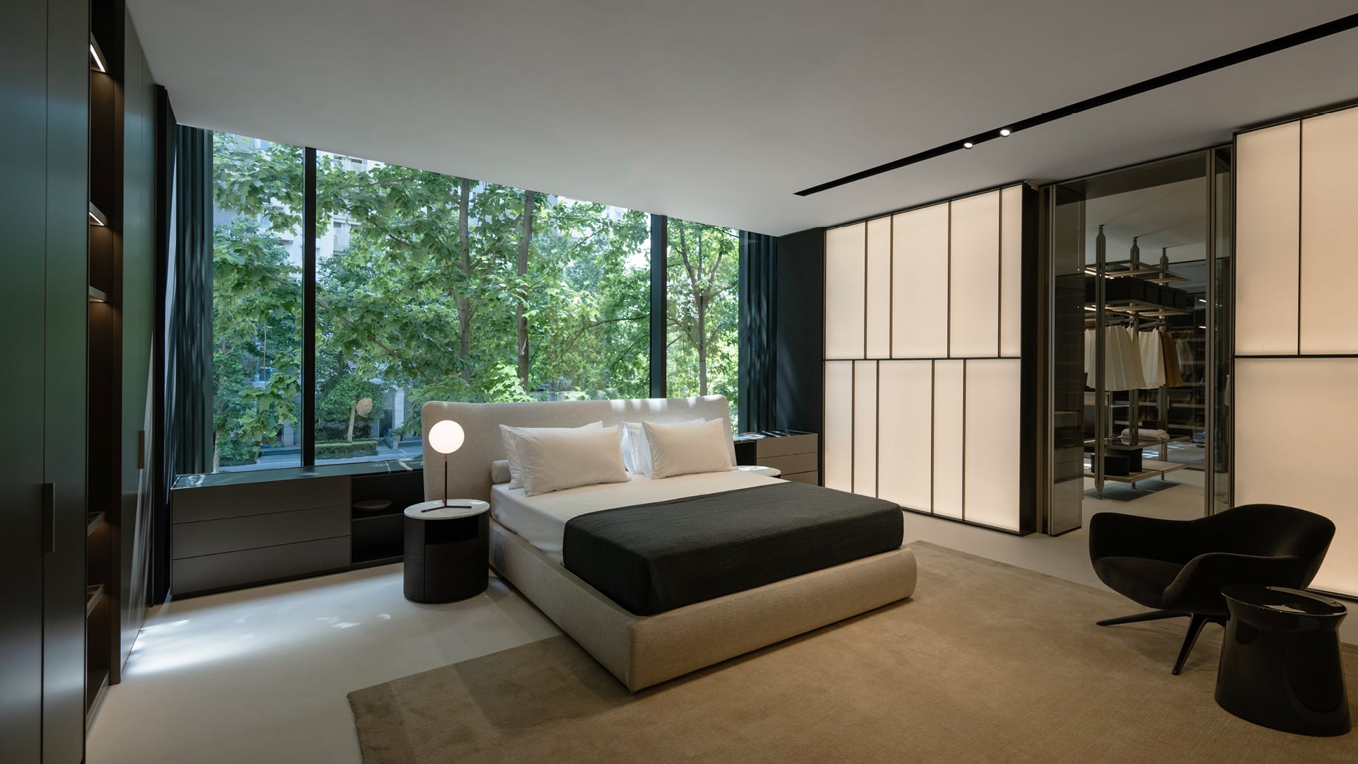 L’intérieur offre un contraste chaleureux et accueillant : des sols couleur crème, des plafonds en chêne blanchi, des panneaux muraux en tissu, des murs en papier de riz rétroéclairé et des tons neutres créent une expérience multisensorielle sur 1 000 m² répartis sur deux niveaux. Les Systèmes Architecturaux Poliform remplacent les cloisons traditionnelles, définissant des espaces fluides et cohérents.