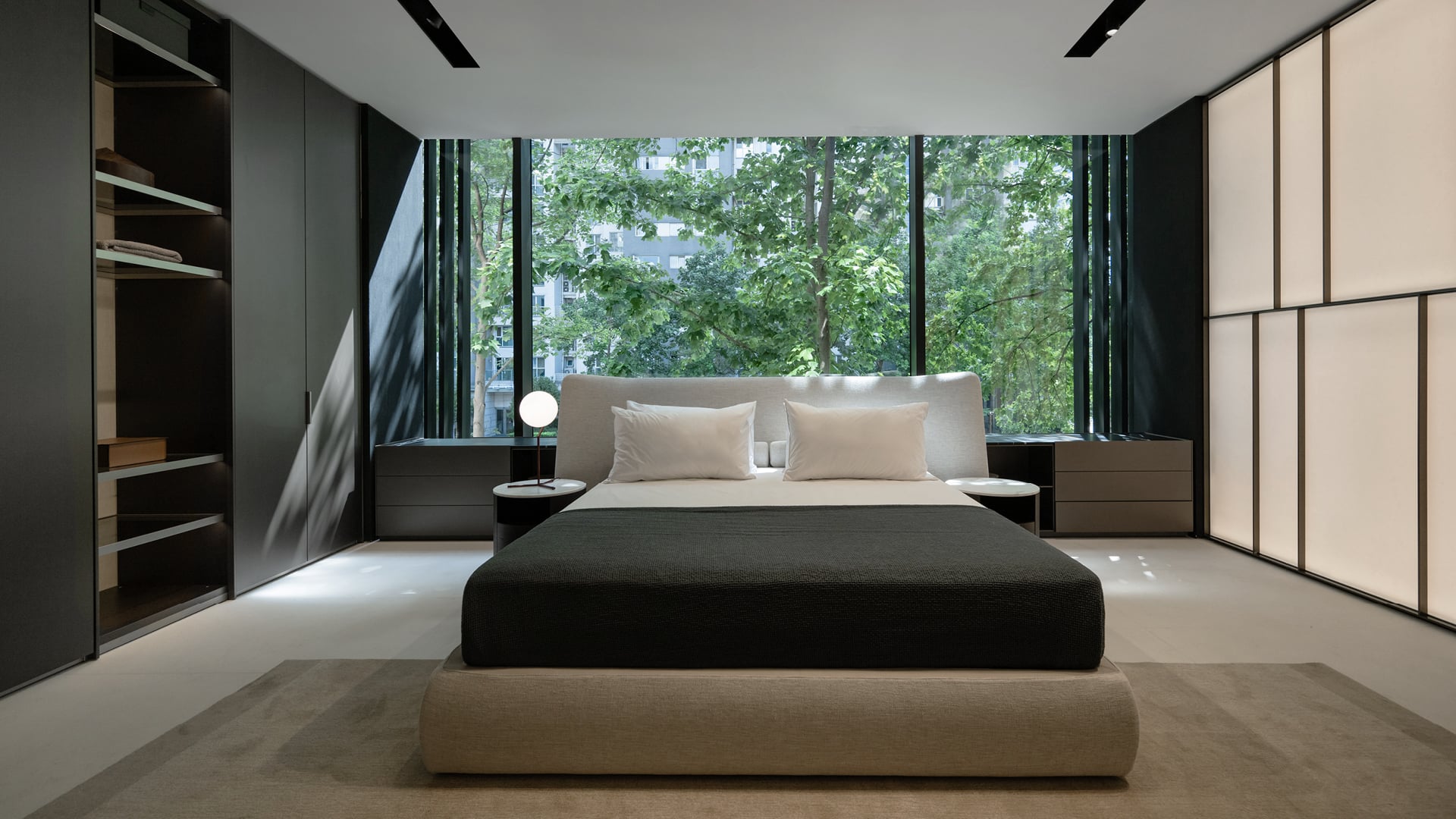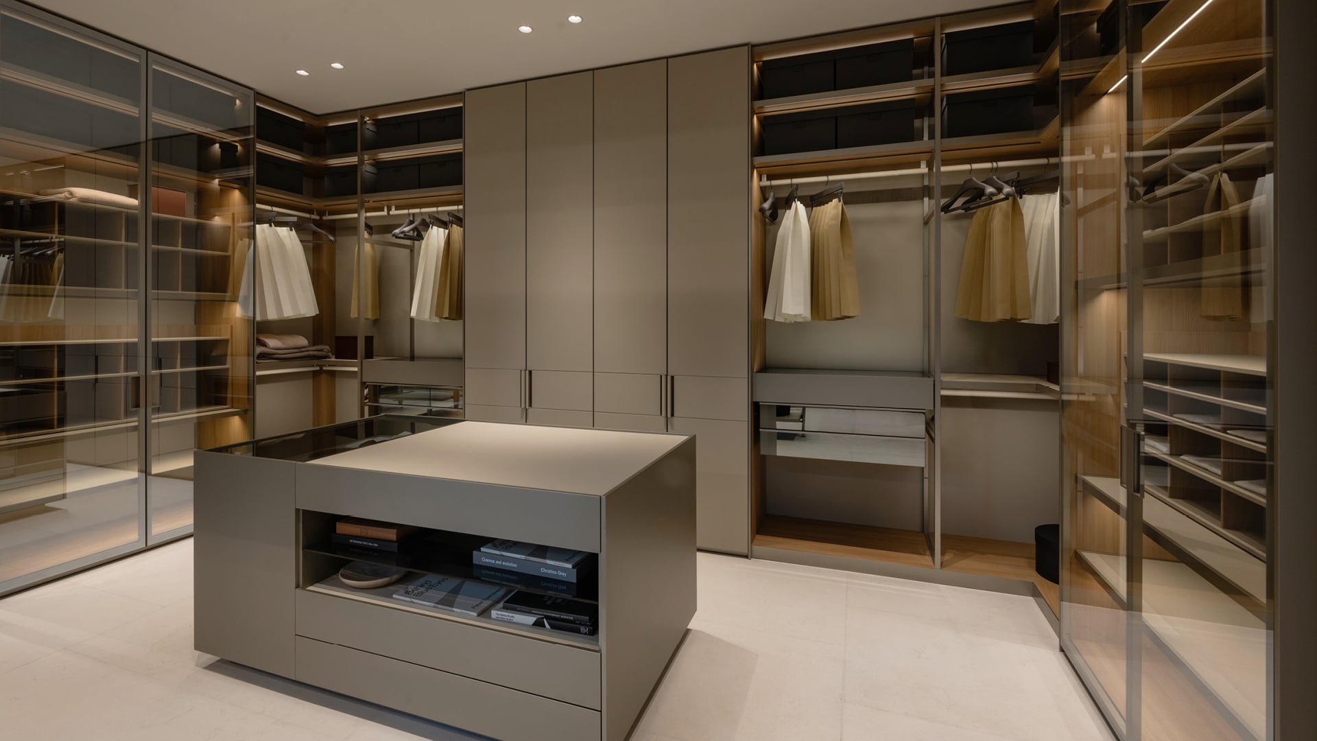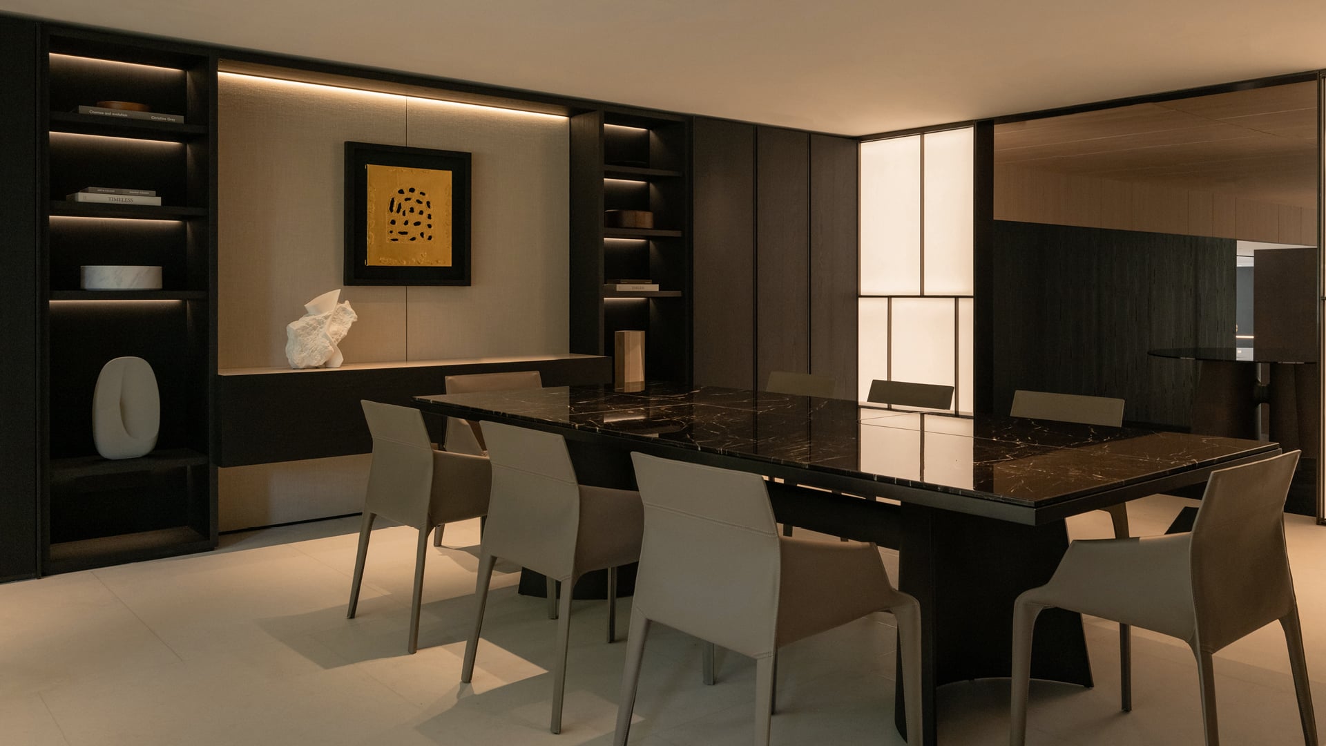 L’intérieur offre un contraste chaleureux et accueillant : des sols couleur crème, des plafonds en chêne blanchi, des panneaux muraux en tissu, des murs en papier de riz rétroéclairé et des tons neutres créent une expérience multisensorielle sur 1 000 m² répartis sur deux niveaux. Les Systèmes Architecturaux Poliform remplacent les cloisons traditionnelles, définissant des espaces fluides et cohérents.