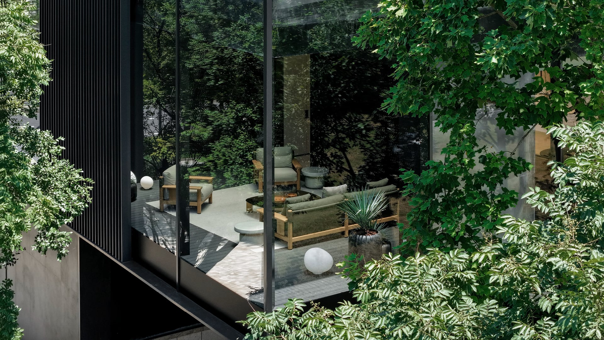 Enfin, un patio extérieur accueille la Collection Outdoor Poliform, qui interprète le style emblématique de la marque en version plein air.