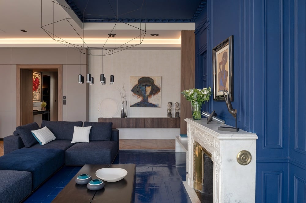 Nos équipes Poliform Lyon ont travaillé de concert avec l’agence d’architecture pour aménager l’intégralité de la cuisine, du modèle Alea de Poliform, imaginée ici avec un îlot central aspect marbre. Elle incarne le cœur névralgique de cet appartement en L aux boiseries et corniches. Ici, nulle salle à manger, l’idée était de concevoir une cuisine ergonomique, pratique, en symbiose avec le salon, plus dans l’esprit d’une bibliothèque décorative. Le canapé du modèle Westside a également été fourni par les équipes Poliform RBC. De finition en tissu Andrea Notte, son coloris rappelle le bleu profond ornant les murs de l’espace salon.