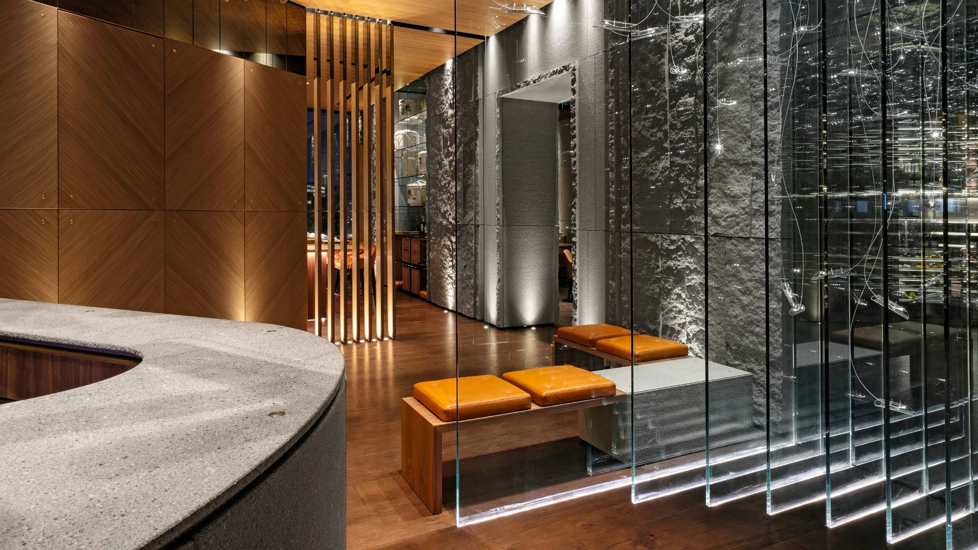 Il contributo di Poliform Contract è evidente sin dall’ingresso realizzato su disegno con lastre in vetro float e specchi fumé che dilata lo spazio, in un gioco di trasparenze e riflessi infiniti. All’interno si è accolti da un’installazione luminosa e un desk, realizzato in porfido grigio-verde fiammato e ottone, che con la sua forma organica introduce un dialogo tra forma e materia che continuerà per tutto il locale. Noce canaletto e porfido sono i materiali predominanti in tutti gli spazi.