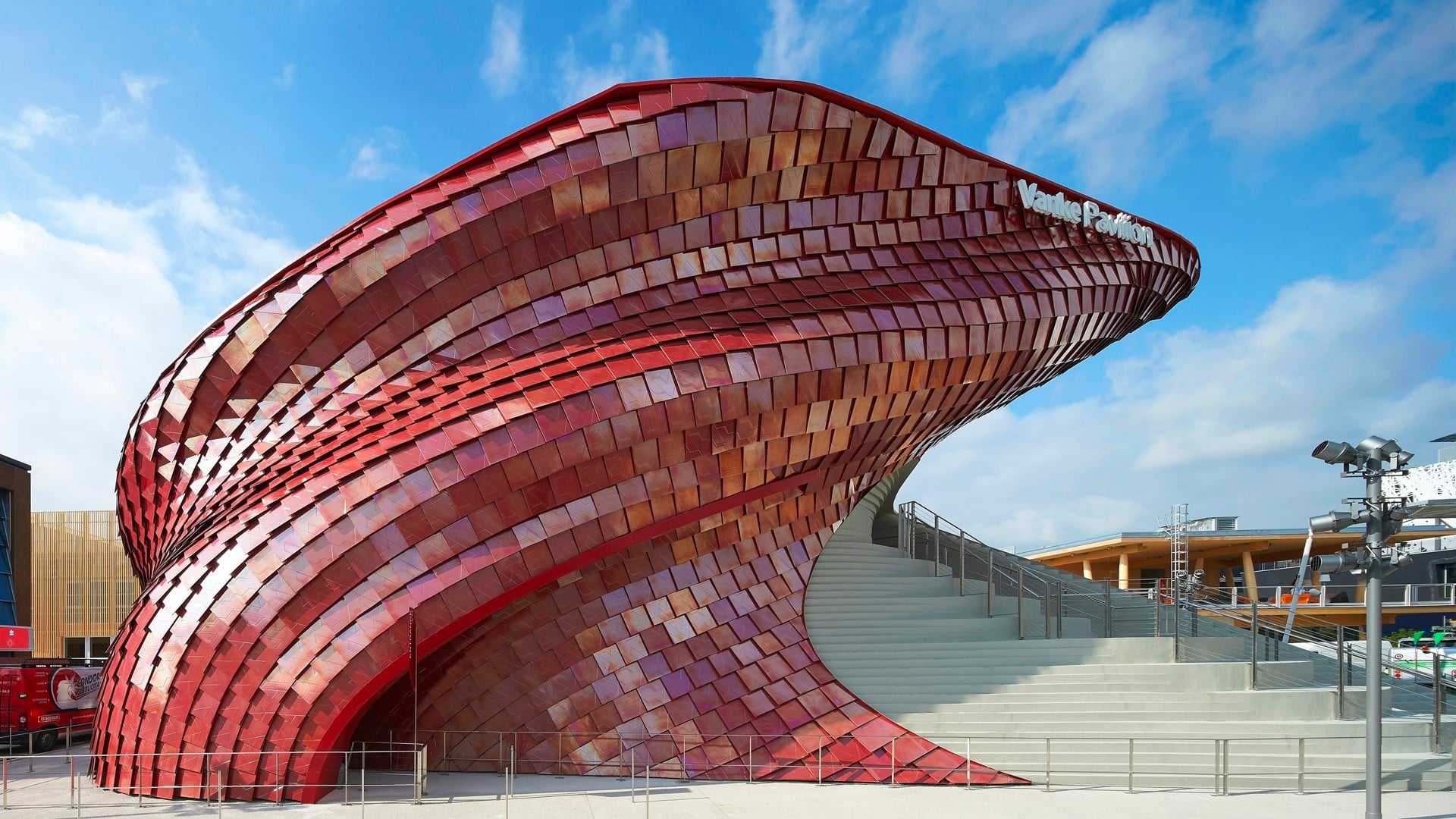 Il rivestimento del padiglione è composto da lastre tridimensionali di grès porcellanato smaltate di un evocativo rosso lacca. La tinta è una cromia speciale formulata e messa a punto appositamente per questo progetto nel laboratorio tintometrico di Casalgrande Padana. Il materiale ceramico adottato per il padiglione Vanke appartiene alla serie Fractile, firmata dallo stesso Libeskind”