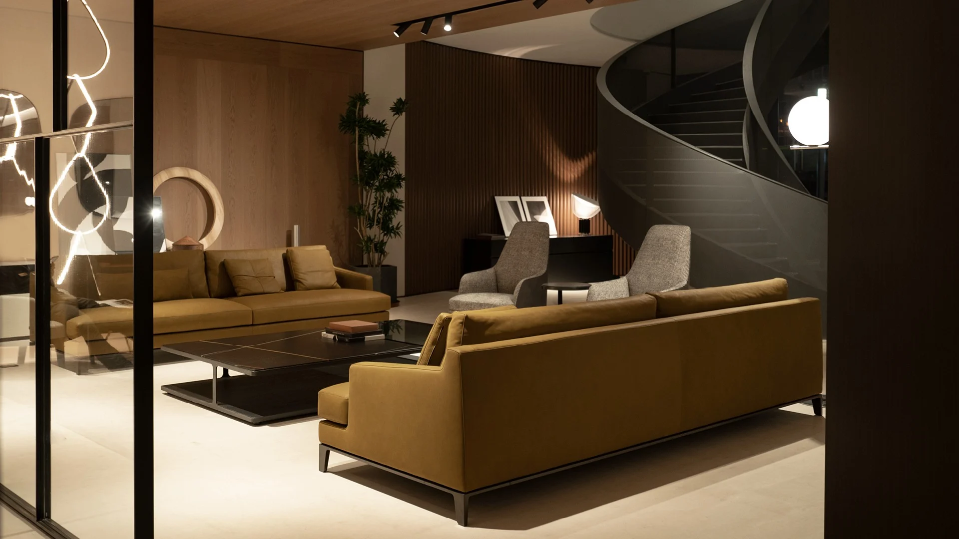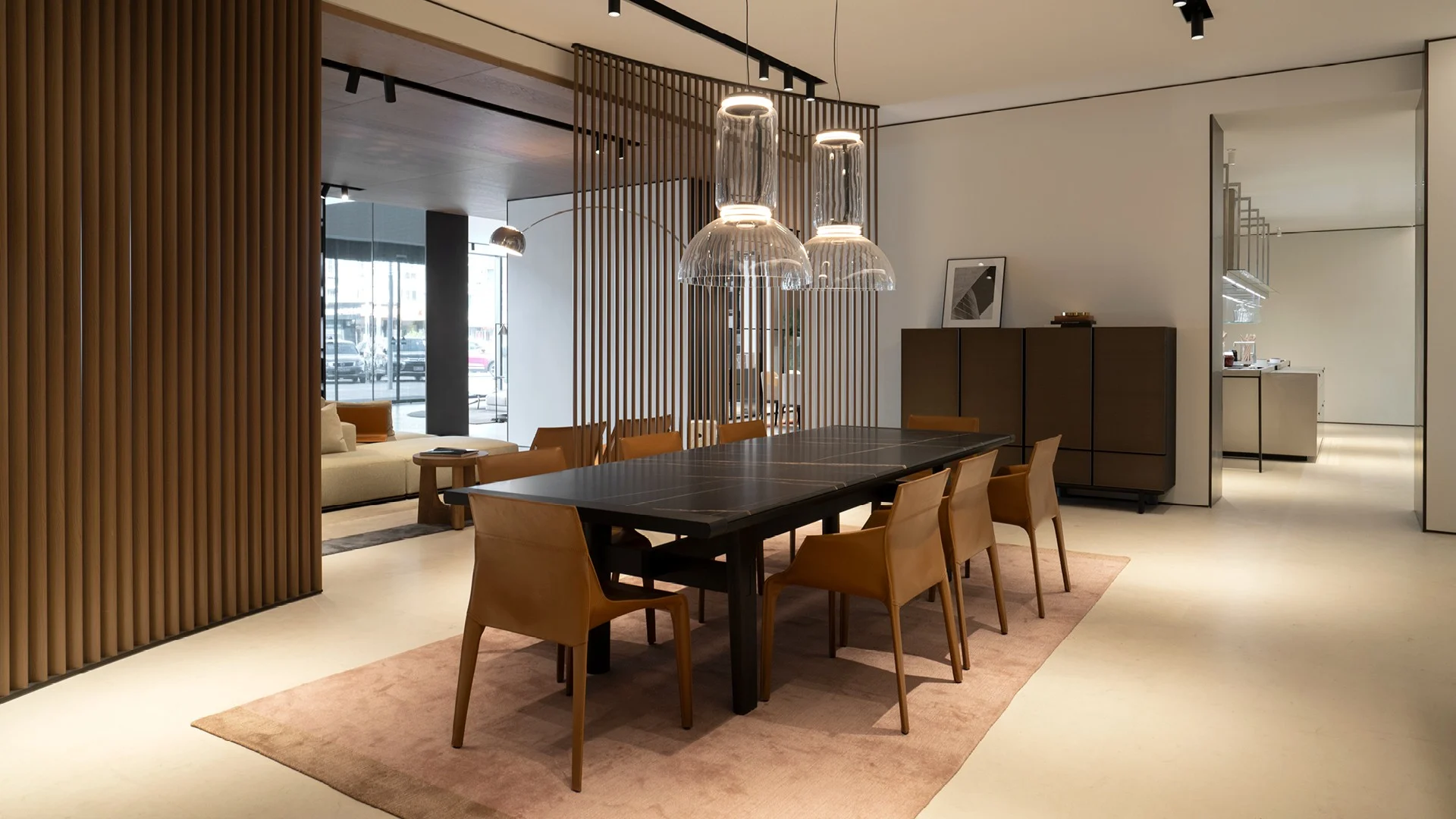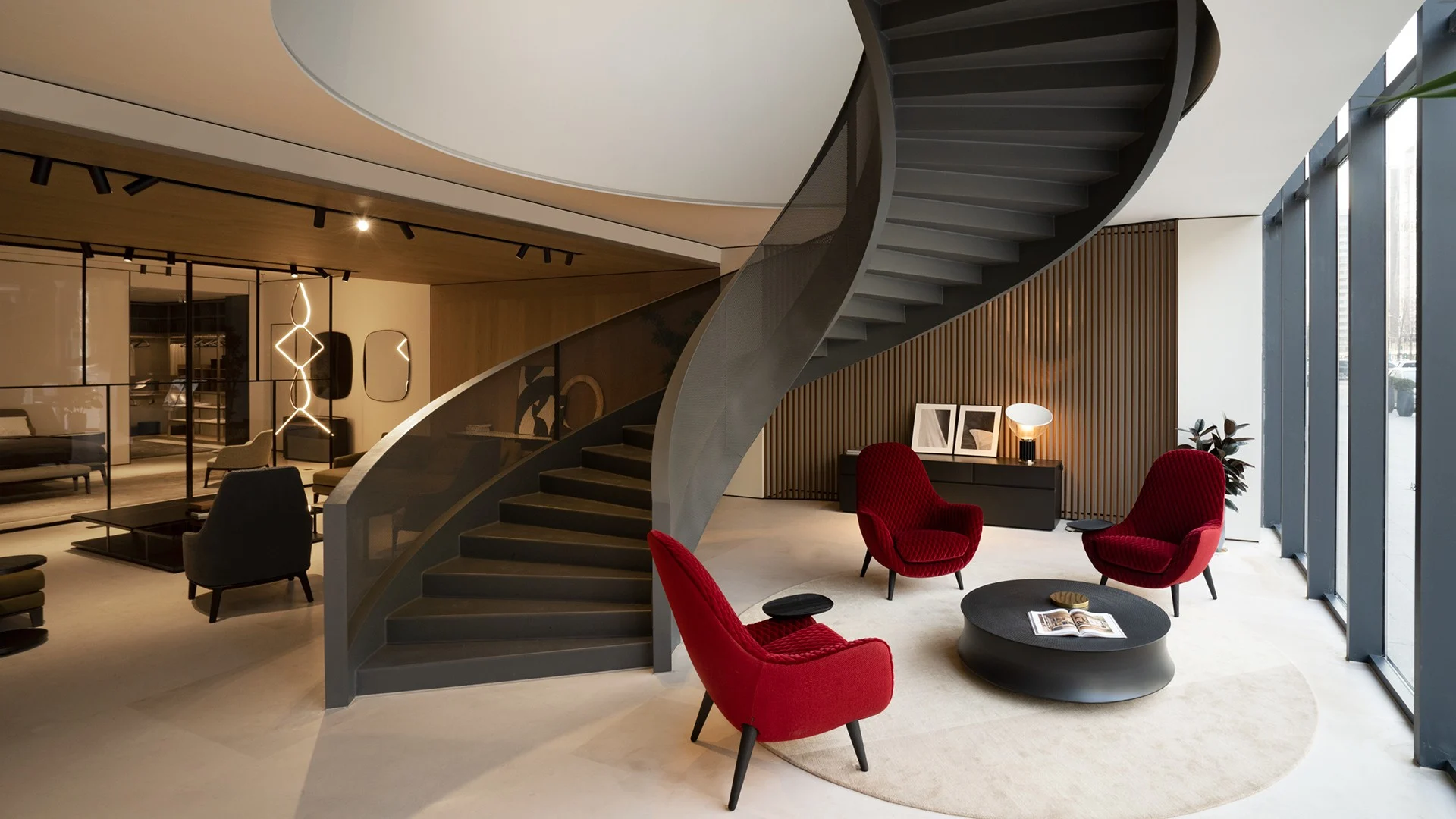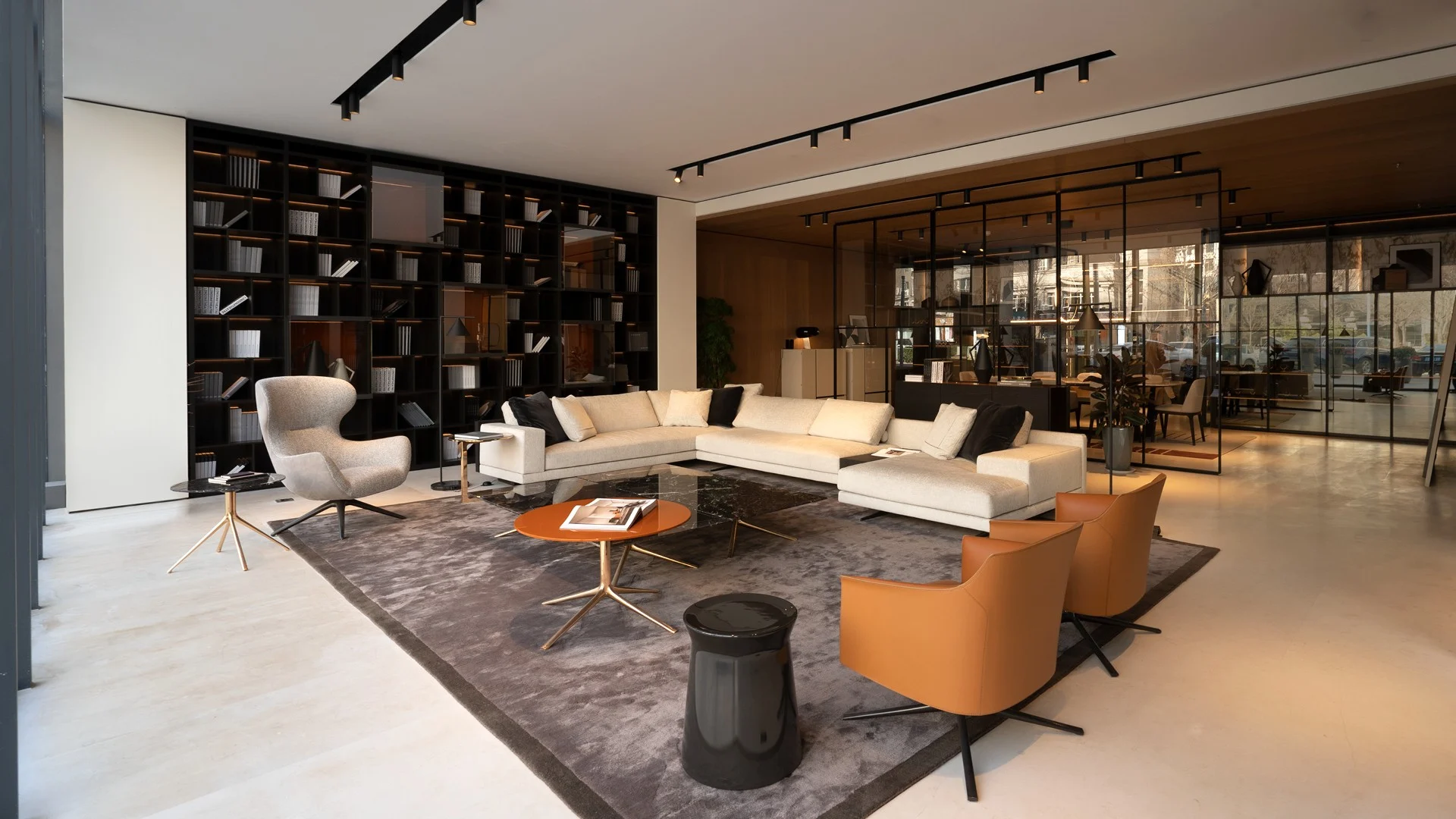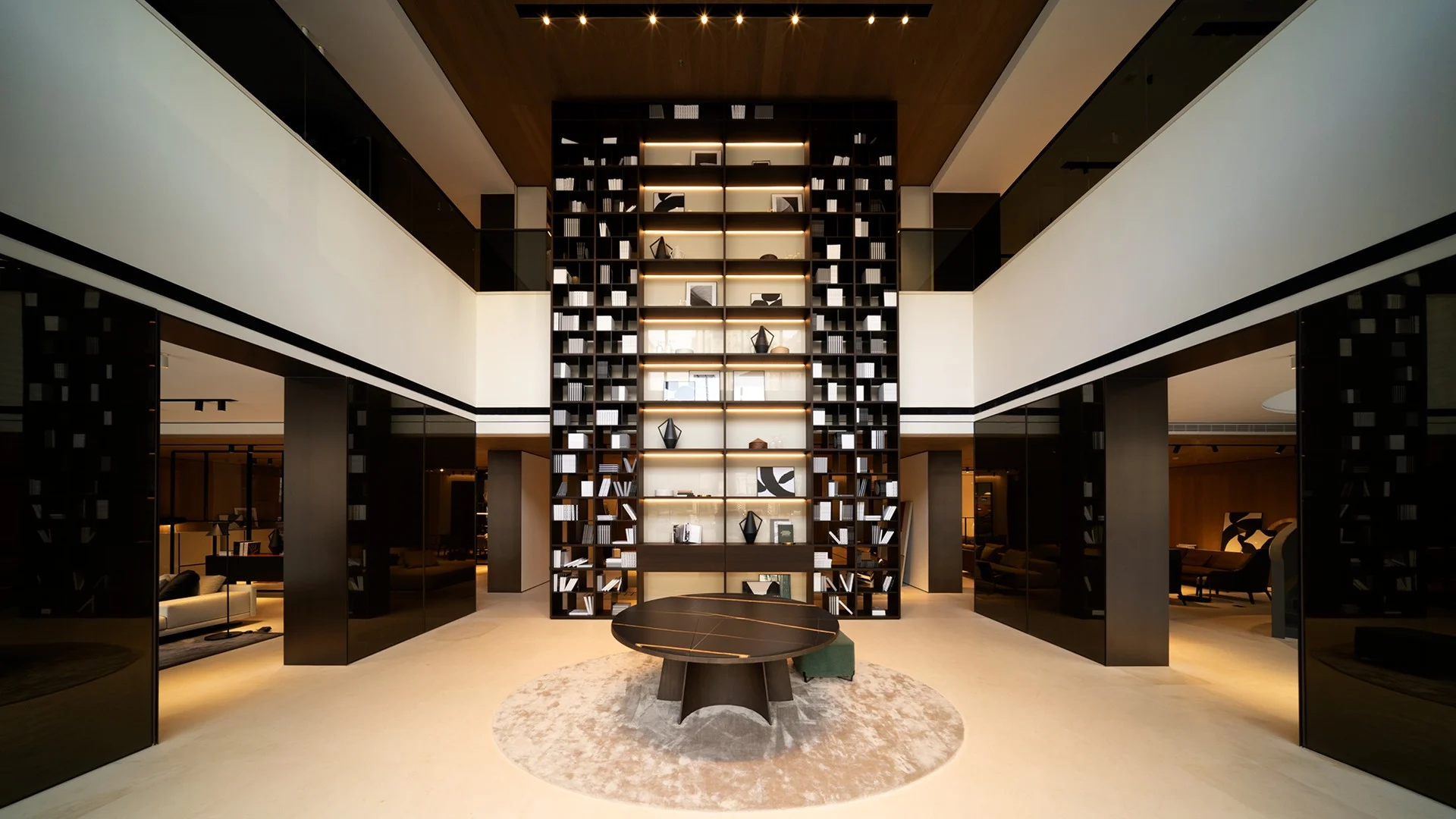 Lo showroom di 800 metri quadri è organizzato su due piani. Di grande impatto l’ingresso, con la libreria Wall System alta otto metri e l’imponente tavolo Kensington. Al piano terra si possono visitare tre zone living che presentano le ultime collezioni Poliform, due dining rooms e una cucina Shape. A completare il piano terra, una zona notte con cabina armadio. Una scala elicoidale conduce al primo piano, dedicato ai sistemi. Qui si trova una cucina disposta a ferro di cavallo con isola centrale Alea, realizzata con le finiture più preziose disponibili a catalogo, e un’area tecnica dedicata agli armadi, con rispettive zone notte.