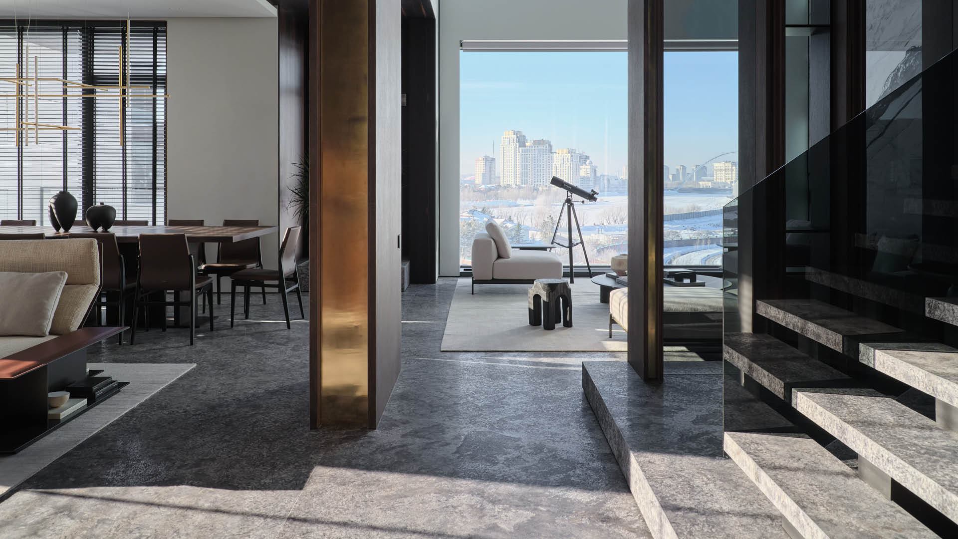 Nel cuore di Astana, l’attico duplex di 330 m² nel prestigioso complesso Akbulak Riviera si sviluppa su due livelli, offrendo ampie vedute sui due fronti fluviali, sullo skyline urbano e sul paesaggio naturale circostante. La residenza si presenta come un rifugio sereno sopra la capitale, dove architettura ed emozione si incontrano in perfetta armonia.